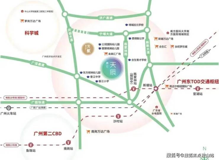 还有规划中的28号线的陈家林路站,距离项目大概只有900米左右,目前规划站点在合生湖山国际那边,但还是存在一定的不确定性,地铁建好开通以后,坐地铁去天河、海珠、黄埔等区也非常方便。