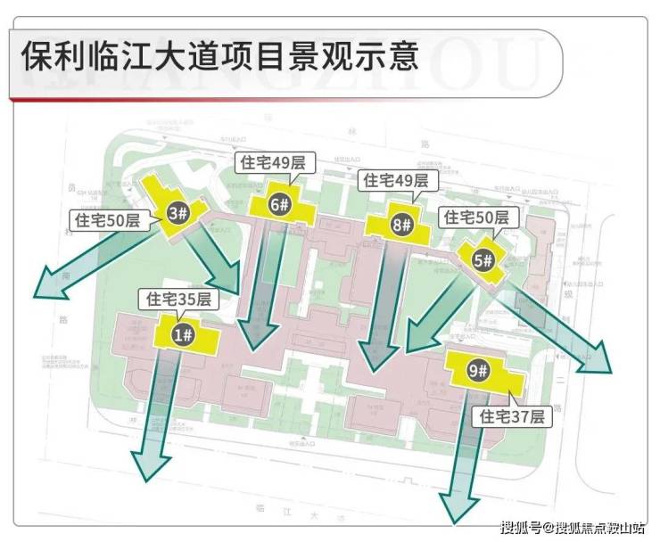 前低后高,前排2栋分别为35层和37层,后排4栋从东往西分别是50层、49层、49层和50层,前高后低的设计,以及后排两栋楼的扭转,也实现了100%望江,货量共约500来套。