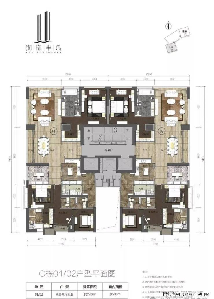 仅有 B、C 两栋 43 层超高层。户型为建面约 290㎡和 315㎡的大平层江景四房,均采用三梯两户的四套房设计,保证了居住的私密性与舒适度,高实用率让空间得到充分利用,满足豪宅居住需求。