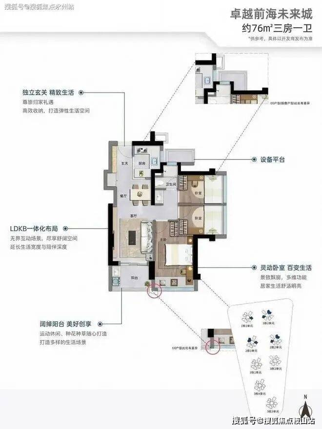 76㎡三房一卫:小三房设计满足三口之家基本居住需求,功能分区明确,兼顾经济性与实用性;