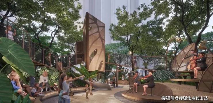 【达尔文营地游乐场】:约1500㎡规模,营地以大叶王国为主题,将生态教育、艺术文化结合成为自然探索乐园、游乐场为一体的多元活动场景。同时于6栋架空层相连,配置儿童自由玩耍的空间。