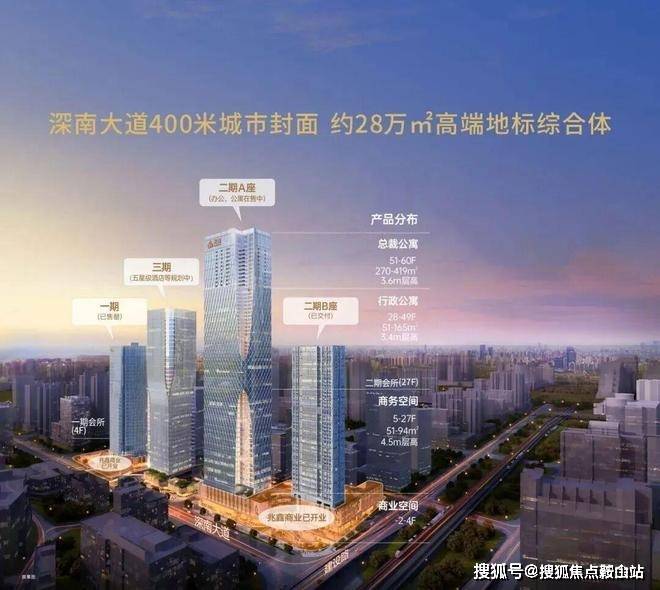 项目占据罗湖金融中心,精英人士汇集。拥揽万象城、金光华等百万明星商圈,由A塔、B塔和裙楼三部分组成。A塔高约261米,是一座办公和高端公寓混合功能的地标塔楼;B塔则为一座标准设计的高层住宅楼;裙楼连接两塔约2.8万㎡商业已开业。