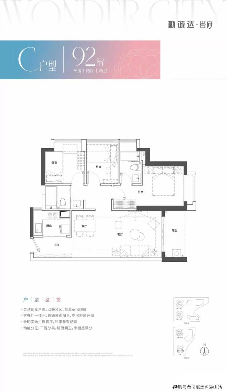 户型面积布局C92平三房两厅两卫设计的是竖厅格局,客厅3.3米开间,LDKB一体化设计,U型厨房还带一个小生活阳台,公卫三段式分离,得房率74.4%(不含赠送),有西南或东南朝向。