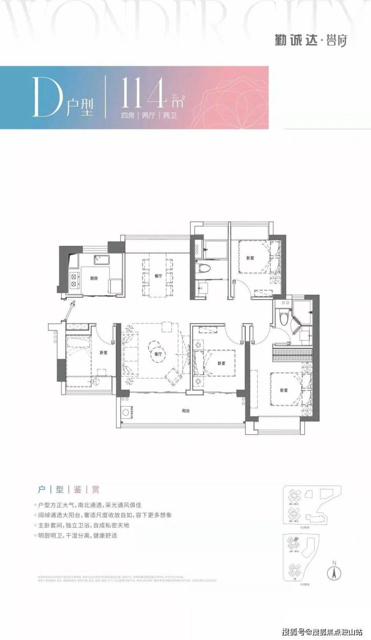 户型面积布局D114平四房两厅两卫设计的是竖厅南北通透格局,四开间朝南,客厅连接次卧出大阳台,U型厨房,公卫三段式分离,得房率72.57%(不含赠送),阳台主朝东南向。