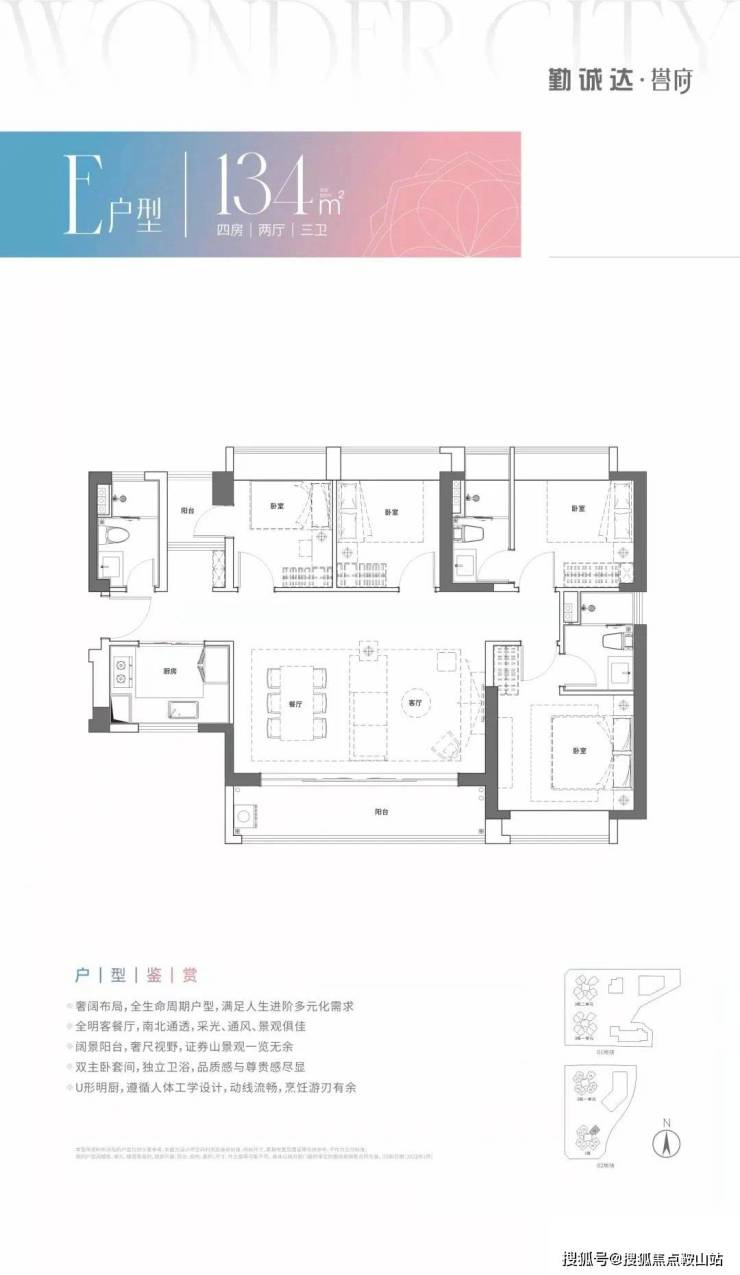 户型面积布局E134平四房两厅三卫设计的是横厅南北通透格局,客餐厅6.4米开间,双套间设计,U型厨房,卫生间干湿分离,得房率74.41%(不含赠送),阳台主朝东南向。