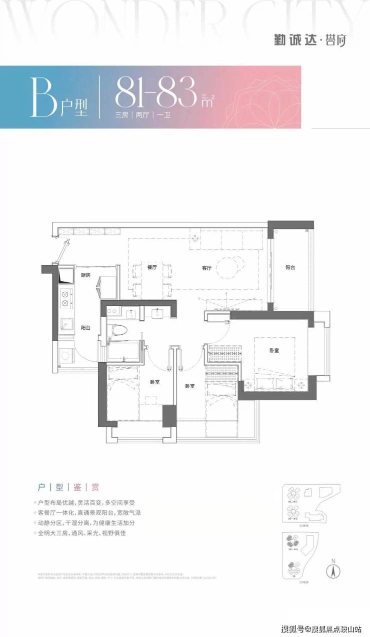 户型面积布局B81-83平三房两厅一卫设计的是竖厅格局,客厅3.2米开间,LDKB一体化设计,一字型厨房还带一个小生活阳台,卫生间干湿分离,得房率74.4%(不含赠送),有西北、西南或东南朝向。