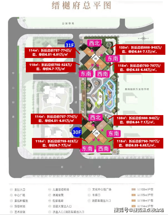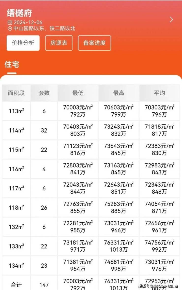 项目首推住宅套数147套,建面约114-115-118-133㎡4-5房,开盘约93折,折后均价6.79万/㎡,单价6.51-7.1万/㎡,总价737-943万/套,精装交付。