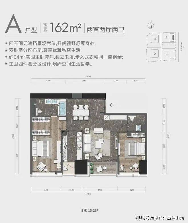 A户型:约162㎡2房2厅2卫:B栋15-26F(中区),东朝向