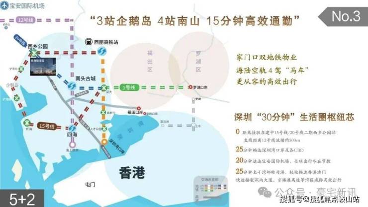 🚄项目紧邻15号线(在建中)西乡公园站约50米,无需换乘,3站直达大铲湾“腾讯科技岛”、5站直达留仙洞总部基地、6站直达前海商务区、9站直达南山科技园,12站抵达后海总部基地,构建半小时通勤圈。