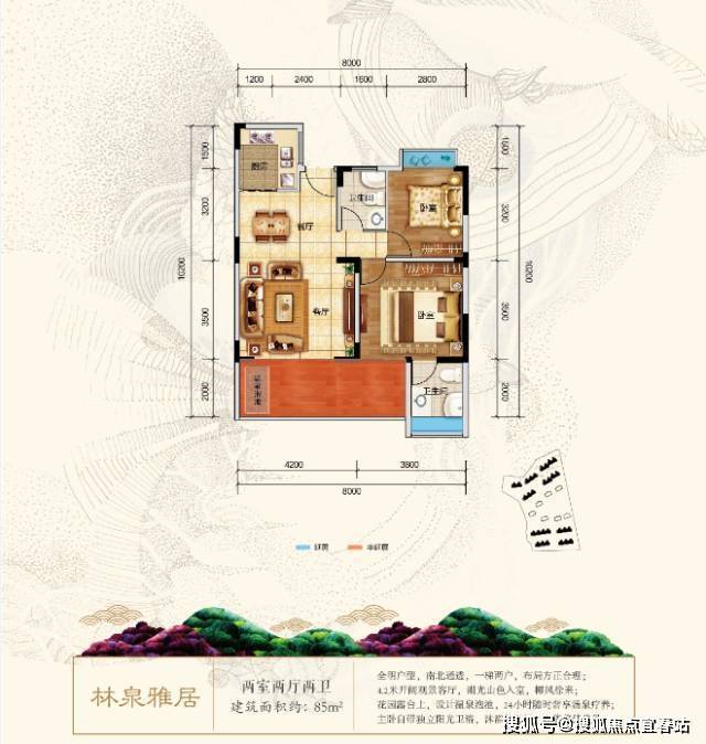 林泉雅居:面积83.53-85.43㎡,赠送12㎡,分布在1#2#3#5#15#16#17#18#19#楼,为两室两厅两卫,明厨明卫,方正、紧凑,布局合理。阳台上设置温泉泡池,
