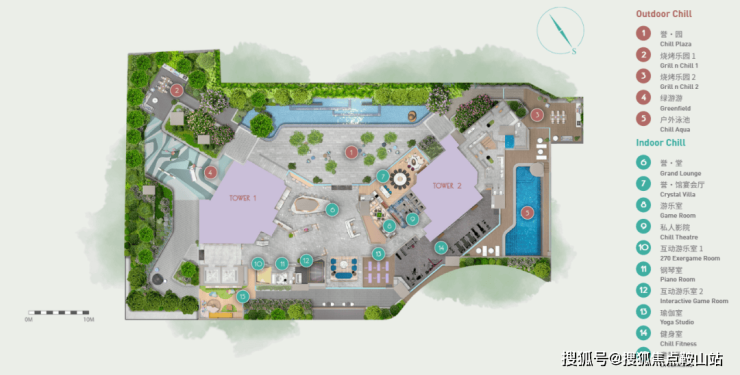 项目住客会所Club@Chill连同5楼园林绿化,面积超过3.06万平方呎,其中户外园林栽种超过百棵常绿树,270度包围平台绿化休憩空间,如城中绿洲。