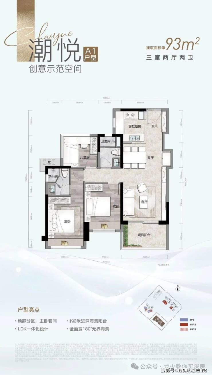 项目整体呈L型,1层作为底商,2楼为花园,3楼起为住宅。3栋住宅户户朝南,除开在后排位93㎡横厅户型外,其他户型都能享受一线海景。