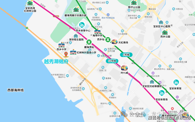 附近还有1号线西乡站,距离稍远约1.9公里,30分钟可到高新园。在深圳远期轨道规划中,项目附近还会有15号线和28号线。
