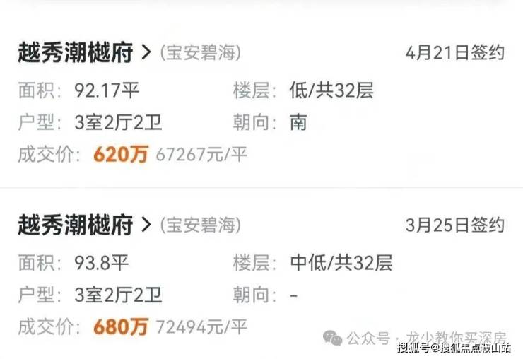 2024年12月31日已交房,至今只有2套中低层93㎡3房成交,单价6.73-7.25万,总价620-680万,对比开盘价不亏不赚。和隔壁华丰前海湾的89㎡3房单价差不多,潮樾府户型景观更好,华丰前海湾品质打造更高端。
