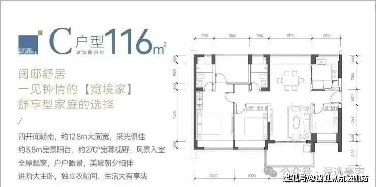 116㎡的4房2厅2卫,C户型,设计的是竖厅南北通透格局,餐客厅一体化设计,客厅3.8米开间,四开间朝南,4个卧室分别做到了主卧17.85㎡/次卧11.4㎡/次卧9.3㎡/次卧8㎡(包含墙体飘窗),都不用搭配飘窗做床,U型厨房,卫生间干湿分离,得房率约:93.13%(包含赠送),阳台主朝西南、东南或正南向。