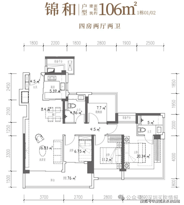 106㎡的4房2厅2卫,设计的是竖厅格局,客厅3.7米开间,LDKB一体化,S墙设计预留冰箱卡槽位,四开间朝南,动静分区,主卧270°无柱转角飘窗还带1个设备平台约1.52平,分别做到了主卧20.34㎡/次卧11.2㎡/次卧7.7㎡/次卧6.75㎡(包含墙体飘窗),U型厨房烟道外置,卫生间干湿分离,得房率约101.16%(包含赠送),客厅连接次卧出大阳台11.76平,东南朝向。