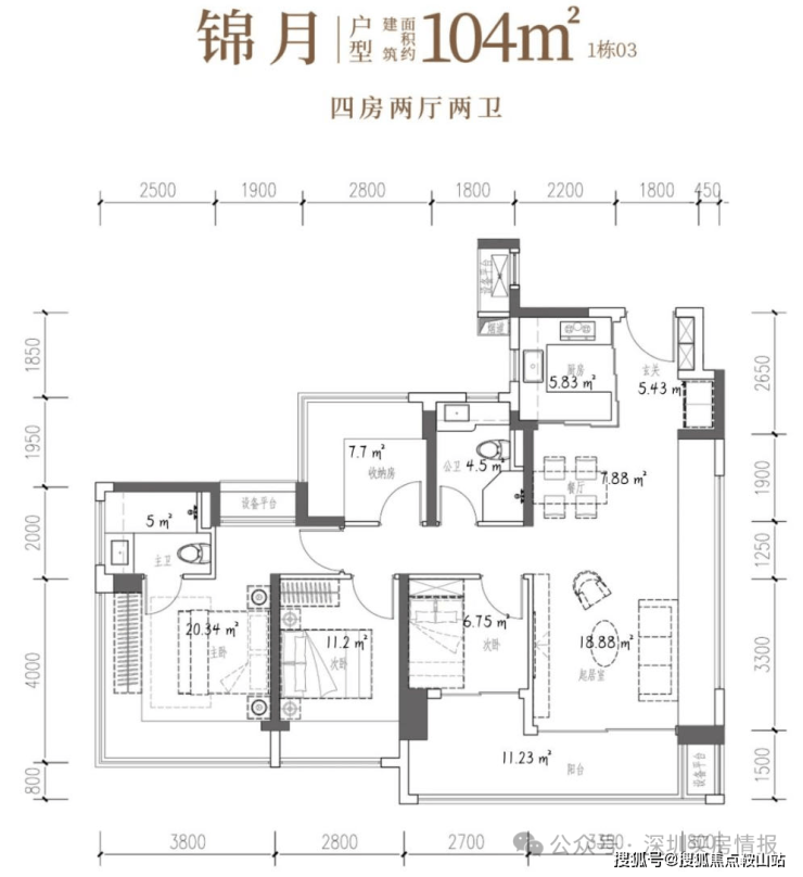104㎡的4房2厅2卫,设计的是竖厅格局,客厅4.15米开间,LDKB一体化设计,预留冰箱卡槽位,四开间朝南,动静分区,主卧270°无柱转角飘窗还带1个设备平台约1.52平,分别做到了主卧20.34㎡/次卧11.2㎡/次卧7.7㎡/次卧6.75㎡(包含墙体飘窗),U型厨房烟道外置,卫生间干湿分离,得房率约100.71%(包含赠送),客厅连接次卧出大阳台约11.23平,西南朝向。