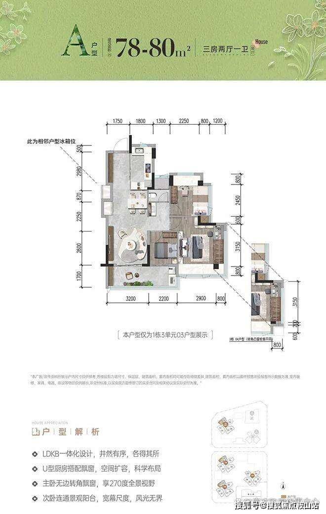 78-80㎡的3房2厅1卫,设计的是竖厅格局,客厅3.2米开间,LDKB一体化,S墙设计预留冰箱卡槽位,动静分区,主卧270无边转角飘窗,3个卧室分别做到了主卧16.62㎡/次卧9.27㎡/次卧5.72㎡(包含墙体飘窗),客厅连接次卧出5.4米长的大阳台,U型厨房,卫生间三段式分离,得房率约93-99%(包含赠送),西北朝向。