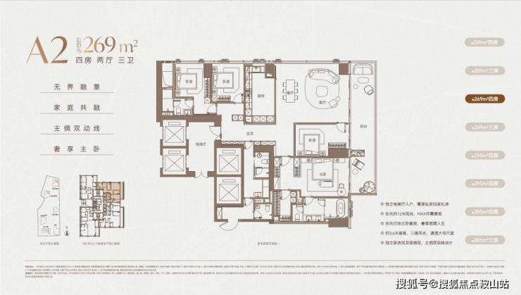 适用家庭:对多功能空间有需求的家庭(如需要独立工作区、兴趣空间),总价3800-5000万(与269㎡同属低区中高端)。