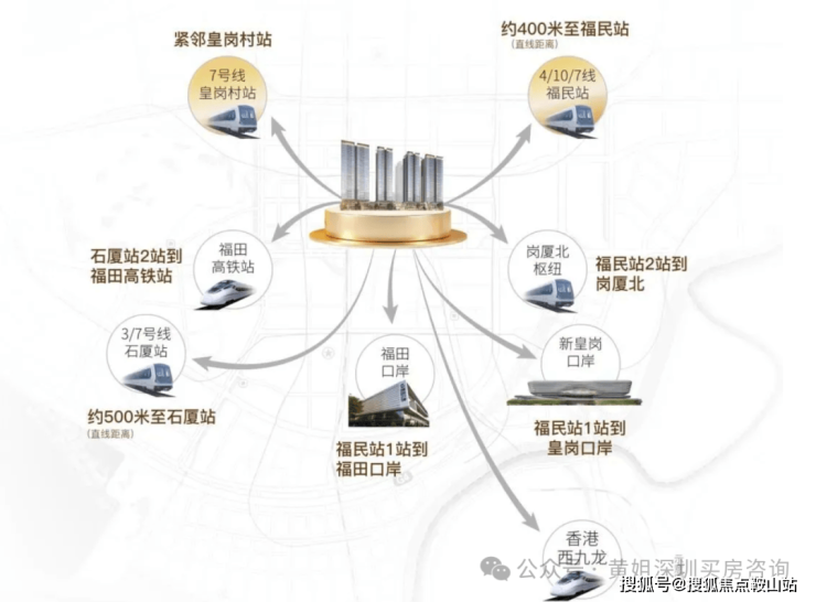 交通方面地铁7号线 皇岗村站E/D口步行100米,4/10号线福民站300米,2站到皇岗口岸(香港通勤党狂喜)。