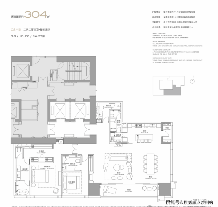 主力户型分析:项目主力户型涵盖建面约303-1032㎡的大平层及顶层复式,全系产品由Yabu Pushelberg、Kelly Hoppen、关永权等国际顶尖设计大师联袂操刀,采用全玻璃幕墙,层高约3.6-4.5米,均通燃气并配备超大观景阳台。其中,约303㎡户型为两房三卫,采用横厅设计;约327㎡户型为三房四卫,配备家政套间及270°环幕视野;约402㎡户型为四房四卫,南北通透;约1032㎡顶层复式为整层一户,配备独立电梯厅及直升机停机坪。