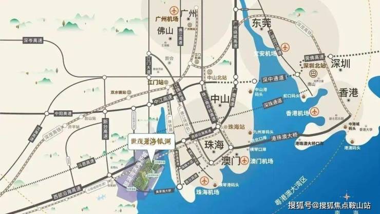 緊密連接港珠澳大橋、深中通道與廣佛都市圈北通道,緊鄰灣區第三大高鐵站江門站,享受黃茅海開通利好,速达港澳直通江门,輻射灣區五大機場,海運直達香港市中心,實現與周邊城市群快速互通。