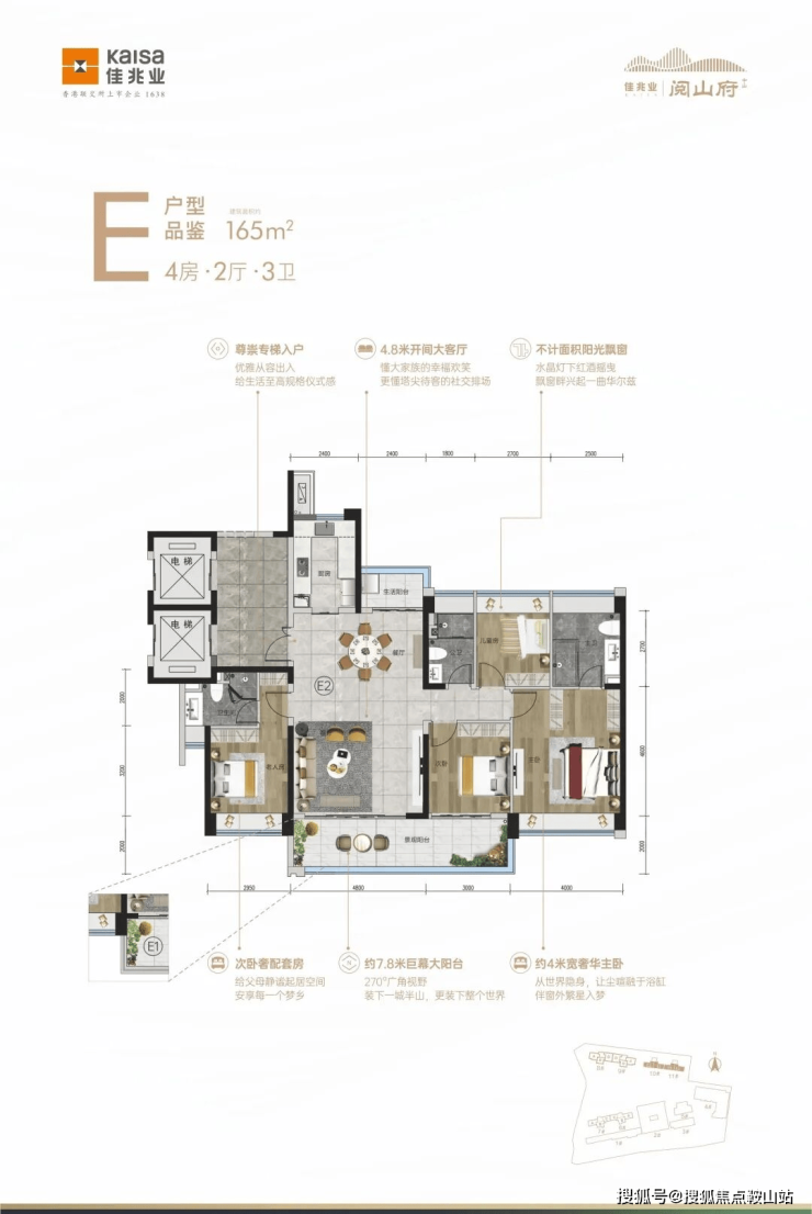 🔷E户型:约165㎡,4房2厅2卫,专梯入户,隐秘尊崇,7.8米巨幕阳台,引景入堂,4米宽奢华主卧,宽享优雅生活。