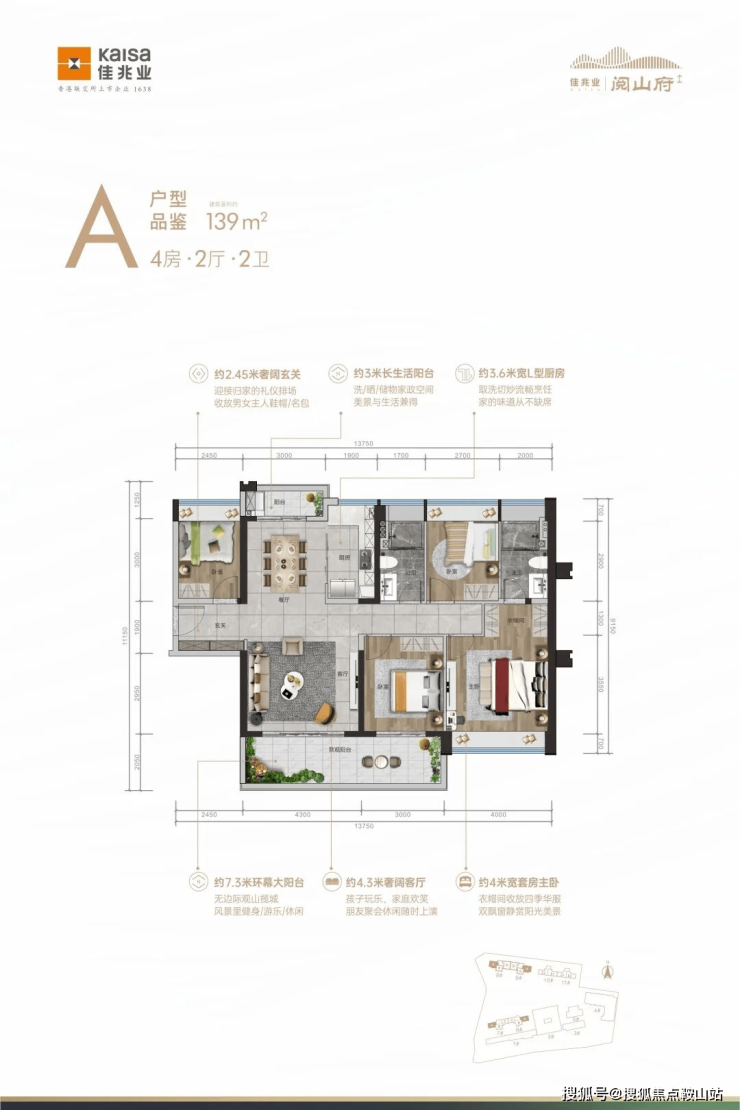 A户型:约139㎡,4房2厅2卫,三开间朝南,13.7米面宽采光,南北双阳台,全明通风佳,奢阔大双厅,空间更自如。
