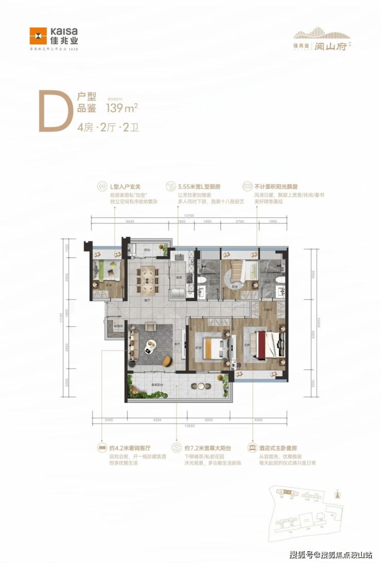 🔷D户型:约139㎡,4房2厅2卫,L形入户玄关,独立空间大收纳,动静布局合理,南北双景阳台,全明通风采光,主卧私密套间,双次卧随心变。