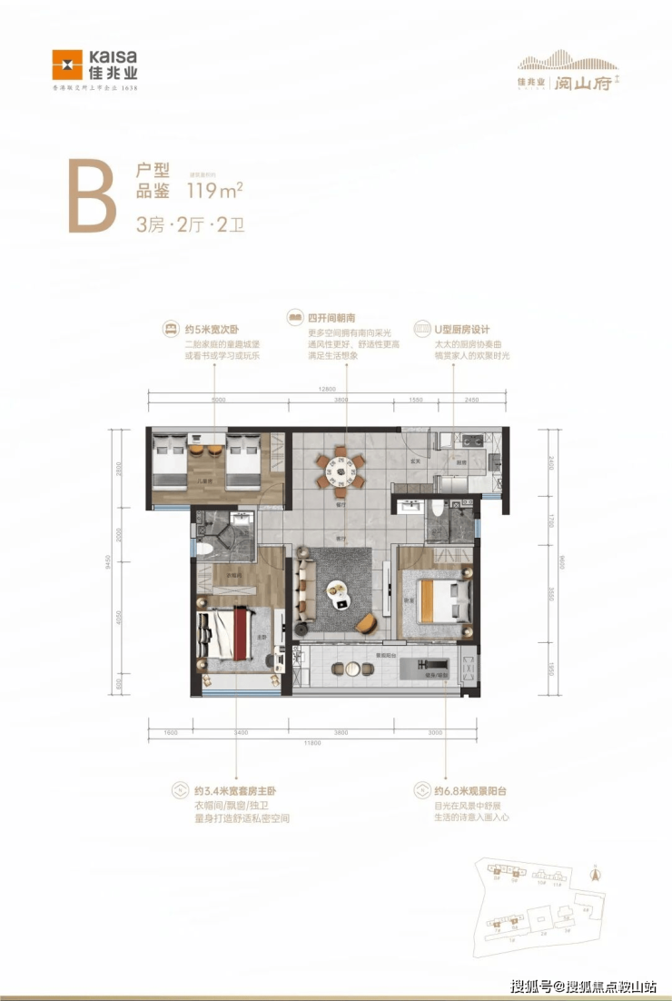 🔷B户型:约119㎡,3房2厅2卫,正南朝向,约12.8米大面宽,通风采光效果好;约6.8米巨幕景观阳台,无敌山景坐收眼底;