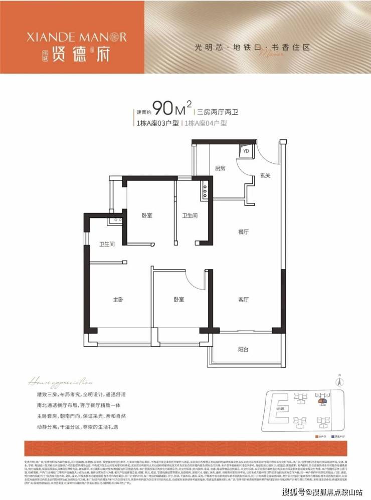 90㎡ 3房2厅2卫传统竖厅设计 3开间朝南,客餐厅南北对流,主卧套房设计。