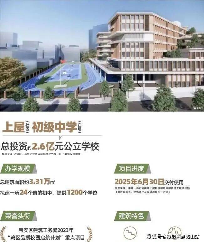 一期自带幼儿园,且临石岩湖东小学,一路之隔即上屋初级中学(在建),约500m可达官田学校,约1km可达宝安中学(集团)石岩外国语学校。