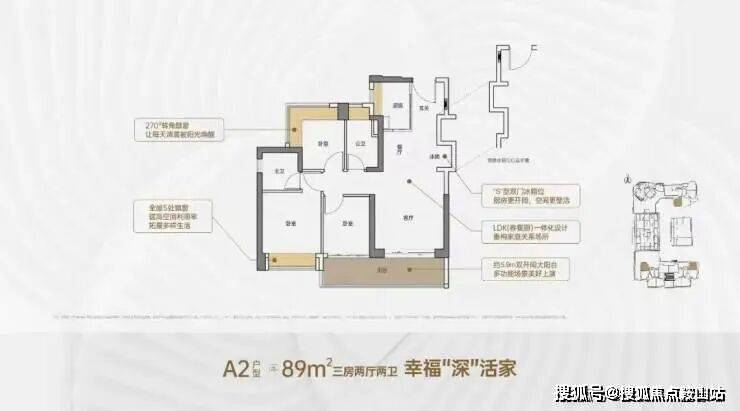 89㎡的3房2厅2卫,A2户型,设计的是竖厅格局,客厅3.5米开间,LDKB一体化,S墙设计预留冰箱卡槽位,客厅连接次卧出5.9米长的大阳台,次卧270度转角飘窗,U型厨房,卫生间干湿分离,阳台有朝西向、东向、南向。