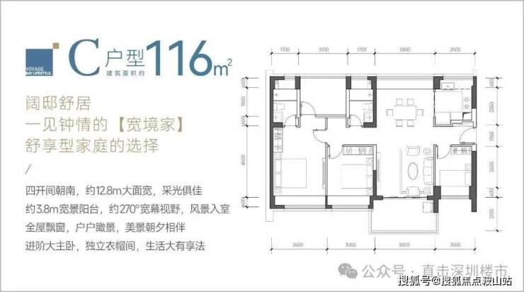 116㎡的4房2厅2卫,C户型,设计的是竖厅南北通透格局,餐客厅一体化设计,客厅3.8米开间,四开间朝南,4个卧室分别做到了主卧17.85㎡/次卧11.4㎡/次卧9.3㎡/次卧8㎡(包含墙体飘窗),都不用搭配飘窗做床,U型厨房,卫生间干湿分离,得房率约:93.13%(包含赠送),阳台主朝西南、东南或正南向。