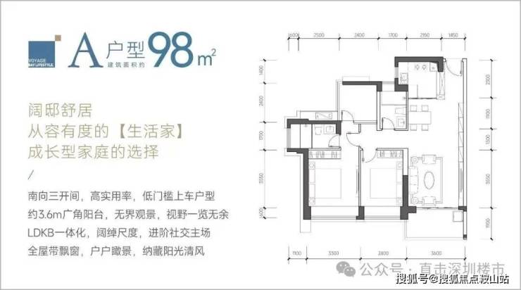 98㎡的3房2厅2卫,设计的是经典竖厅格局,LDKB一体化设计,客厅3.6米开间,三开间朝南,动静分区,3个卧室分别做到了主卧13.69㎡/次卧11.62㎡/次卧5.76㎡(包含墙体飘窗),都不用搭配飘窗做床,L型厨房,卫生间干湿分离,得房率约:89%(包含赠送),西南、东南或正南朝向。