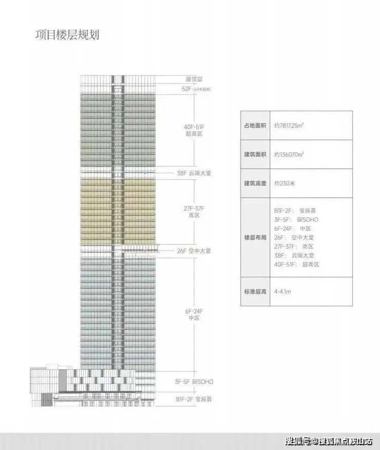 华侨城宝辰总高230米,为宝中最高楼;项目52层,分为中区、高区、超高区,6层起卖,11、39F为避难层,25-26F为空中会所,28F为空中大堂。除了空中大堂项目还有地下入库大堂+首层大堂,一共三重大堂。