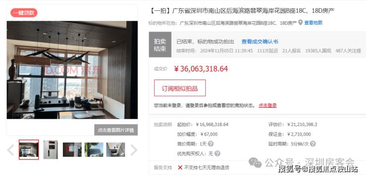 无敌看海的住宅中信元湾府,隔壁一路之隔翡翠海岸都卖20万的二手房,11月5日,翡翠海岸一套177平的法拍房有21名客户参与竞拍,加价219次,最终以3606.3万成交,成交单价20.4万/平,比起拍价高出1909.5万。