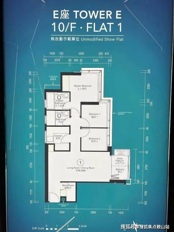 项目开放示范单位E座10楼1室为蓝本,实用面积683平方呎,采3房1套连储物室间隔。
