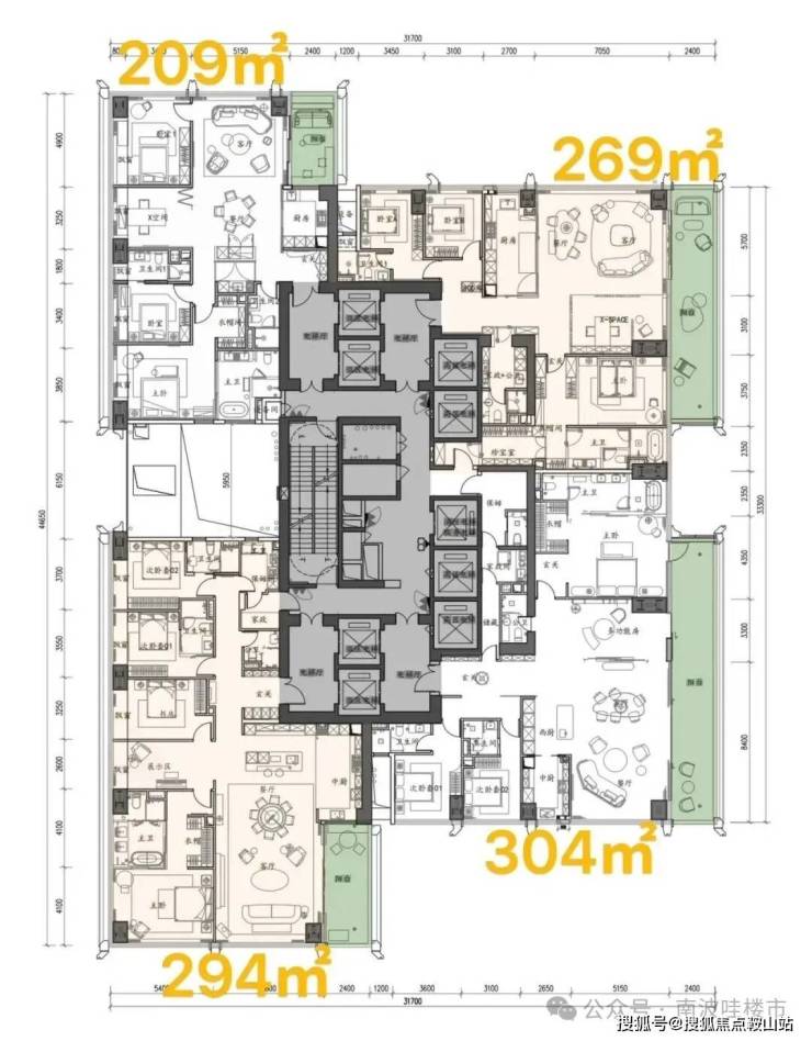 ——高区 42F起(150-200米)是约370-375-403㎡4+1房五卫+家庭厅+家政套间;
