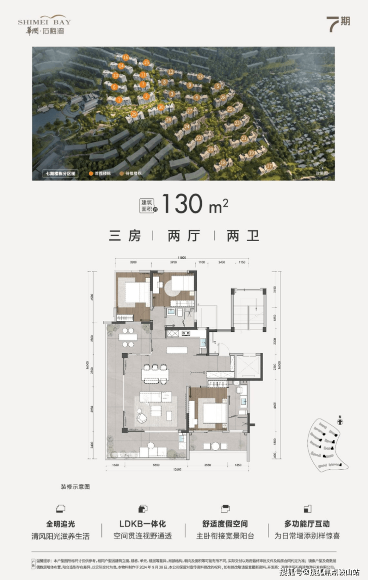 |建筑面积约105㎡○三卫设计,舒适起居,生活自在不拥挤○户型方正,全明设计,纵览山海风景○LDKB专享度假感格局,丰富生活层次○餐客厨与卧室,南向三开间,阳光满室○套房式主卧,约8.4m朗阔阳台,环瞰山海