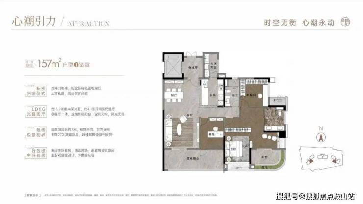 157平是四房两厅两卫户型,是传统的竖厅设计,动静分区,厨房后面有一个生活阳台,主卧设计了270度弧形飘窗,视野采光好。
