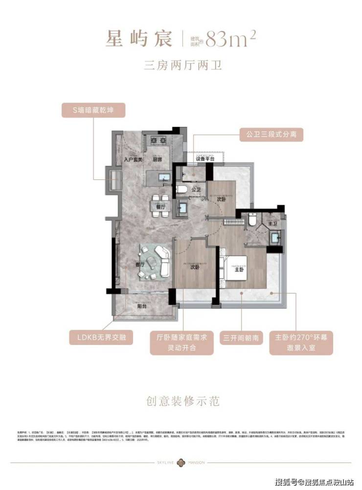乐城3期是新规产品,得房率得到很多提升,高达100%,其中83㎡做到了3房2卫,99㎡做4房2卫。另外乐城3期都是非超高层(29-32层),所有单元均为3梯6户,户型朝向错开设计,确保每一户都是全南向户型,采光充足。在装修方面,也进行了全面升级。