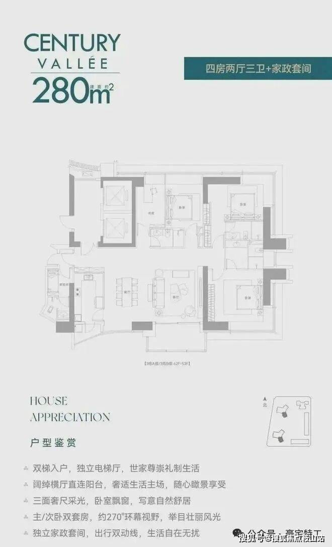 【约233㎡3+1房3卫】双梯入户,独立电梯厅,餐客大横厅贯通阳台,三面采光,主次卧尽享270°环幕视野,还有独立家政套间,西北朝向看名商和沙河高尔夫