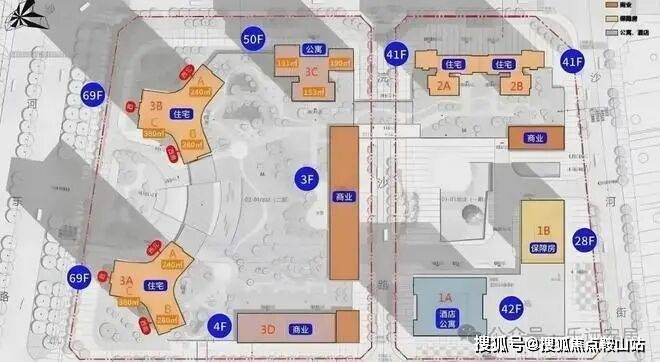 整个项目分两期开发建设,其中:项目一期东地块包含1栋酒店+商务公寓、1栋保障房、2栋包含一、二单元的住宅;西地块包含2栋高约250米的超高层住宅,另有1栋约50层高的商务公寓。