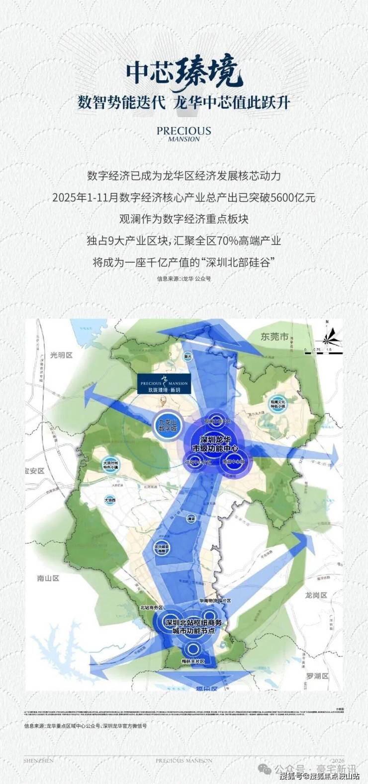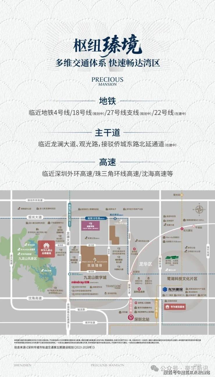 玖珑瑧境,位于深圳市龙华区福城街道荣富路与塘北路交汇处,紧邻福民山水公园,是福城南产业片区土地整备利益统筹留用地开发项目的重要组成部分,地处深圳未来18个核心建设区域之一九龙山数字城,项目北侧临观光路,西侧紧邻龙澜大道,南侧紧邻福花路,距离东侧梅观高速2.0公里。