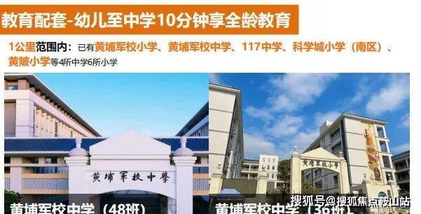 教育——周边已有的117中学、科学城小学(南区)、黄陂小学、木棉小学、黄埔军校小学(36 班)等中小学;而且在项目斜对面就是黄埔军校中小学(规划了 48 班),师资雄厚。