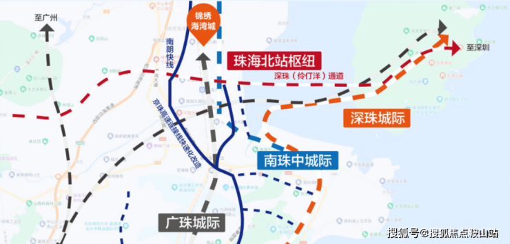 深珠通道高速公路终点北围互通立交,穿行中山·敏捷锦绣海湾城项目旁,与中山东部外环高速(规划在建中,预计2026年通车)相接;城际铁路接入珠海北站,中山·敏捷锦绣海湾城项目距珠海北站仅约1.5公里(来源:百度地图),紧邻深珠通道落脚点。