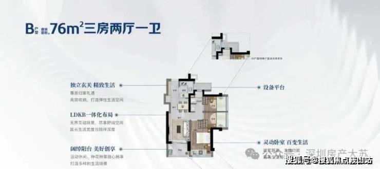 86㎡的3房2厅2卫,设计的是经典竖厅格局,客厅3.2米开间,入户玄关八宝库,LDKB一体化,S墙设计预留冰箱卡槽位,动静分区,三开间朝南,U型厨房,公卫三段式分离,还送1个设备平台,得房率约75.9-76.6%(不含赠送),西南或东南朝向。