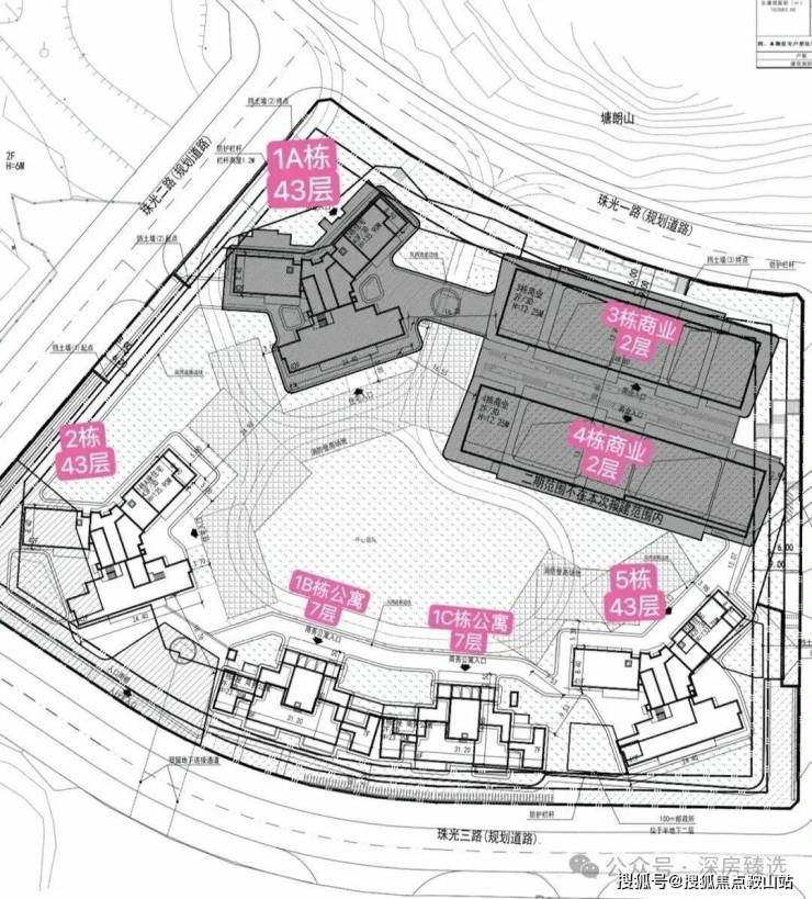 而可售的商品房位于03-01地块,比较靠近塘朗山,也分两期开发。规划共448户住宅,其中小于90平的产品有338户,最高楼层43层。