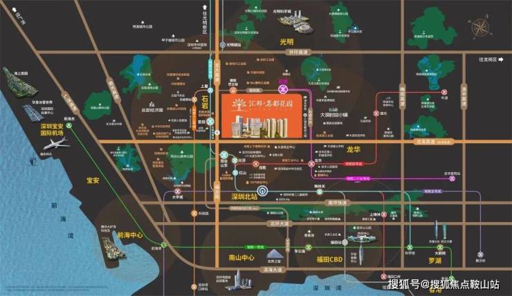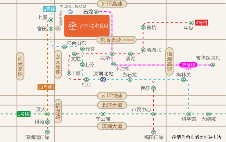 项目位于龙大高速水朗出口旁,紧邻地铁25号线石龙站(在建中,预计2028年通车);邻近地铁13号线(在建中),地铁6号线官田站,1站阳台山站 (在建中),5站深圳北站,7站抵达福田;畅享龙大、南光、广深、沈海 (机荷) 四大高速路网,出门即上高速,自驾通达全城。社区接驳优点巴士,6条短线直达6大地铁站 (龙胜、元芬地铁站接驳已开通),3条快线直达车公庙/大剧院/科技园等中心区。
